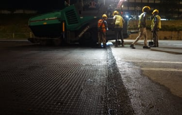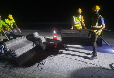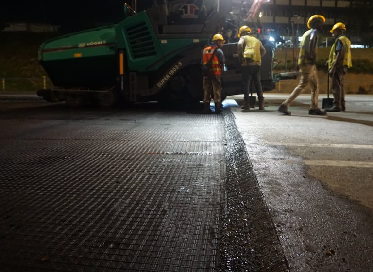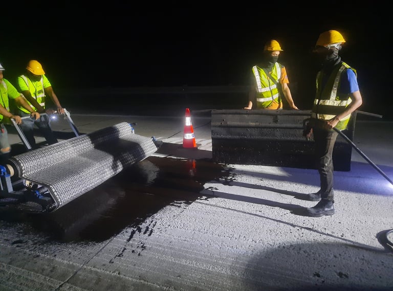 A 50 mm asphalt overlay is placed over the aging CRCP, utilizing Samigrid XP50 (German technology) as a stress-absorbing membrane interlayer (SAMI) to mitigate and retard the propagation of reflective cracking into the new pavement